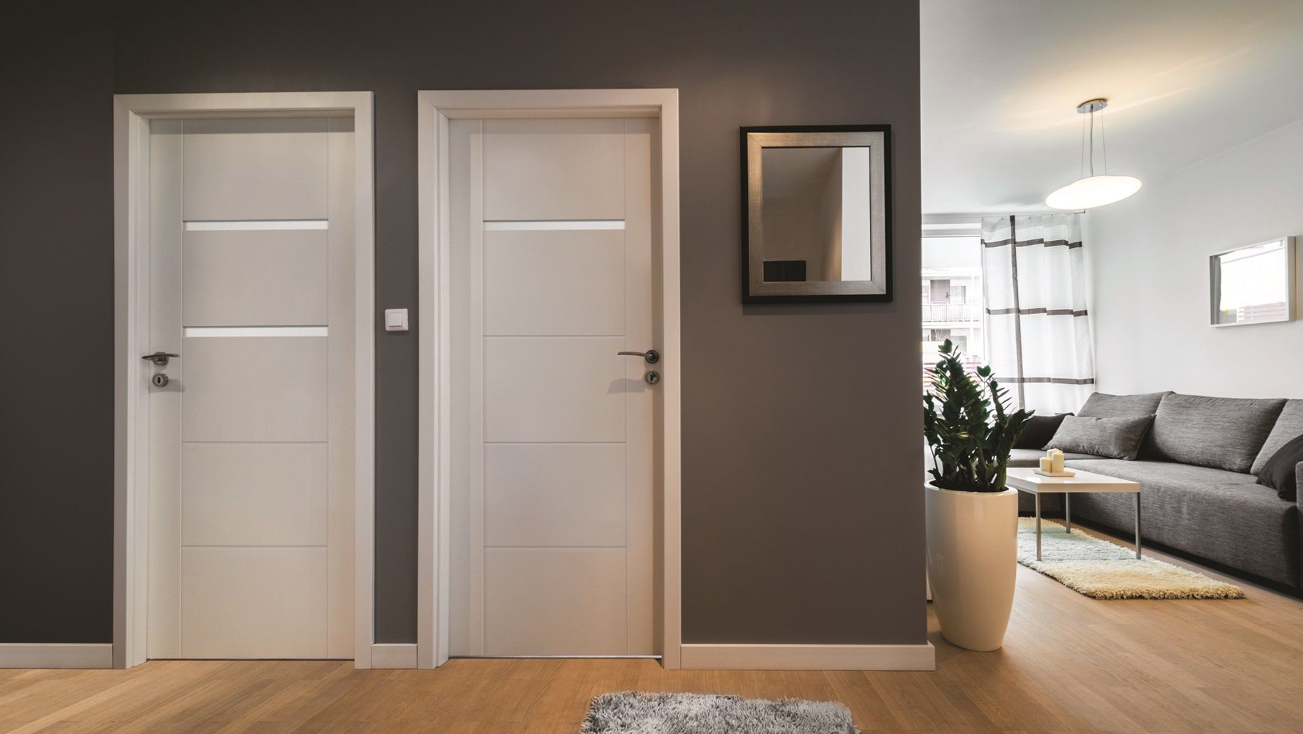 »»Ușa este realizată din rama lemn plăci HDF încastrate, acoperite cu furnir natural sau finisaj de suprafață LAMISTONE CPL si Silkstone.